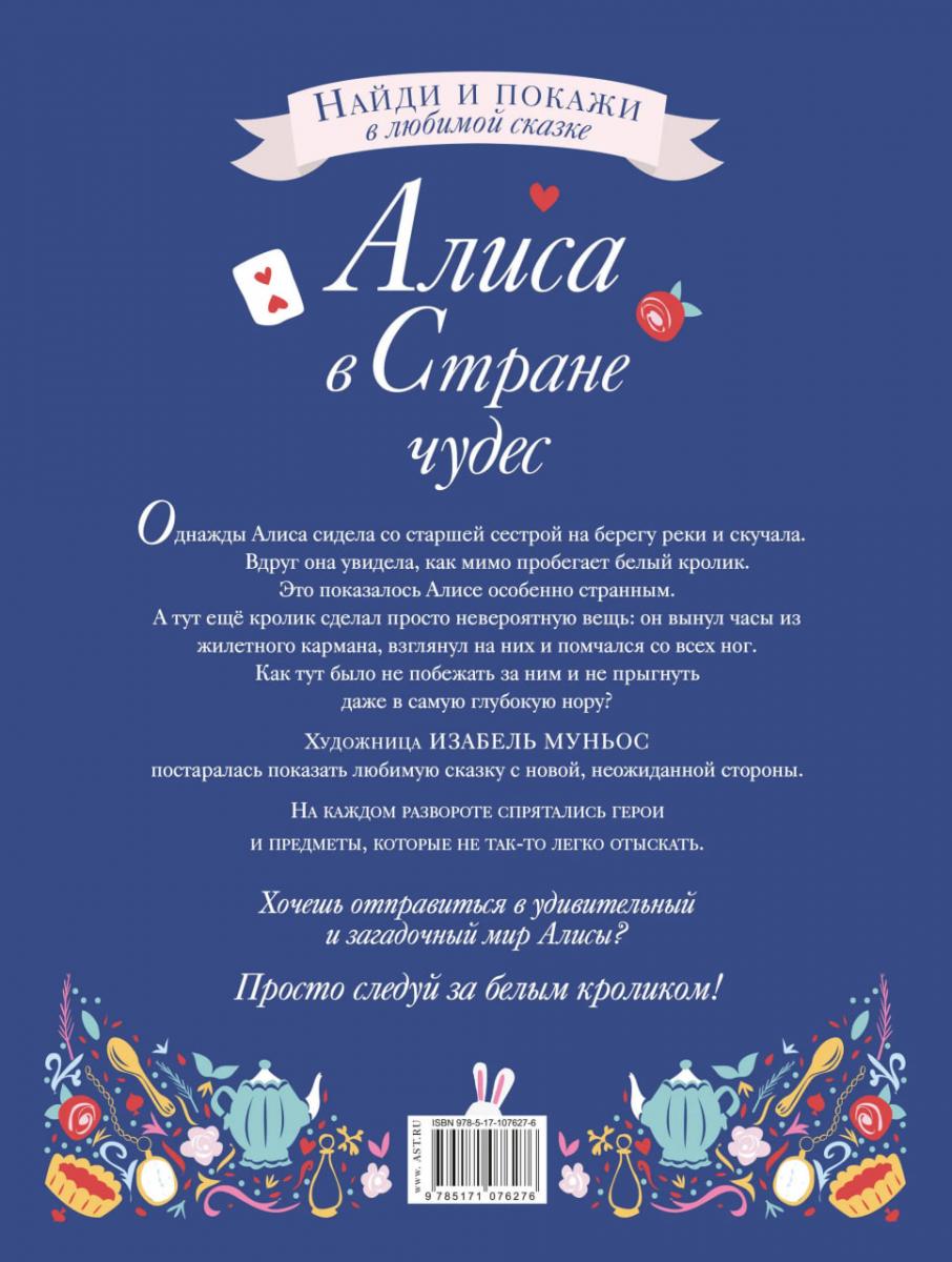Редакция «Вилли Винки» представляет! Однажды Алиса сидела со старшей сестрой на берегу реки и скучала. Вдруг она увидела, как мимо пробегает белый кролик. Это показалось Алисе особенно странным. А тут ещё кролик сделал просто невероятную вещь: он вынул часы из жилетного кармана, взглянул на них и помчался со всех ног. Как тут было не побежать за ним и не прыгнуть даже в самую глубокую нору? Художница Изабель Муньос постаралась показать любимую сказку с новой, неожиданной стороны. На каждом развороте спрятались герои и предметы, которые не так-то легко отыскать. Хочешь отправиться в удивительный и загадочный мир «Алисы в Стране чудес»? Просто следуй за белым кроликом.