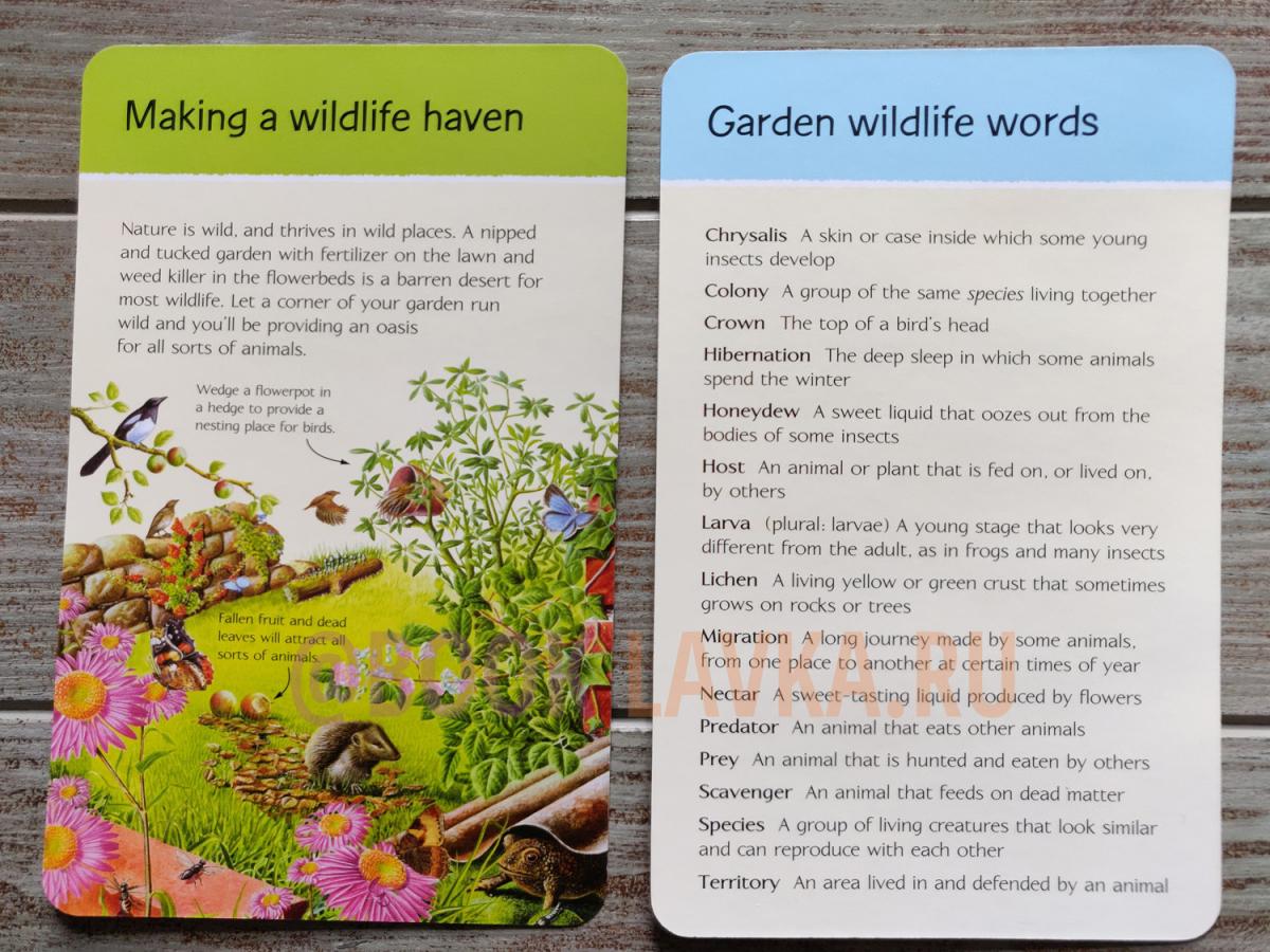 A pack of pocket-sized cards to help identify 100 species of insects, birds and animals found in gardens. Each side of each card shows a detailed picture for identification along with a description and interesting facts and statistics. With internet links to fun websites full of photos, games and more information.