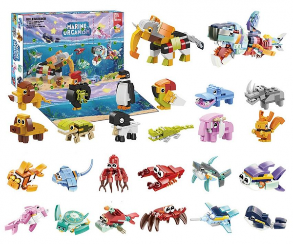 Внутри окошки с мини-конструкторами из которых можно создать 24 животных. Фишка этого календаря в том, что из этих деталей можно ещё собрать двух больших животных (слона и акулу).
