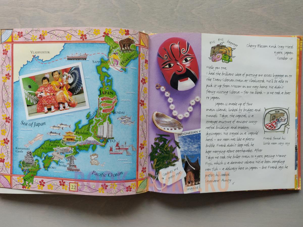 Aunty Dot and Uncle Frank have won a fabulous globetrotting world trip for two. Before she leaves, Aunty Dot promises to write to her niece and nephew to tell them all about the exotic places she visits with Uncle Frank and to send them lots of holiday souvenirs.