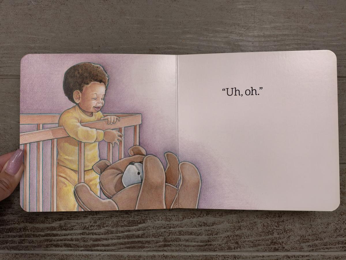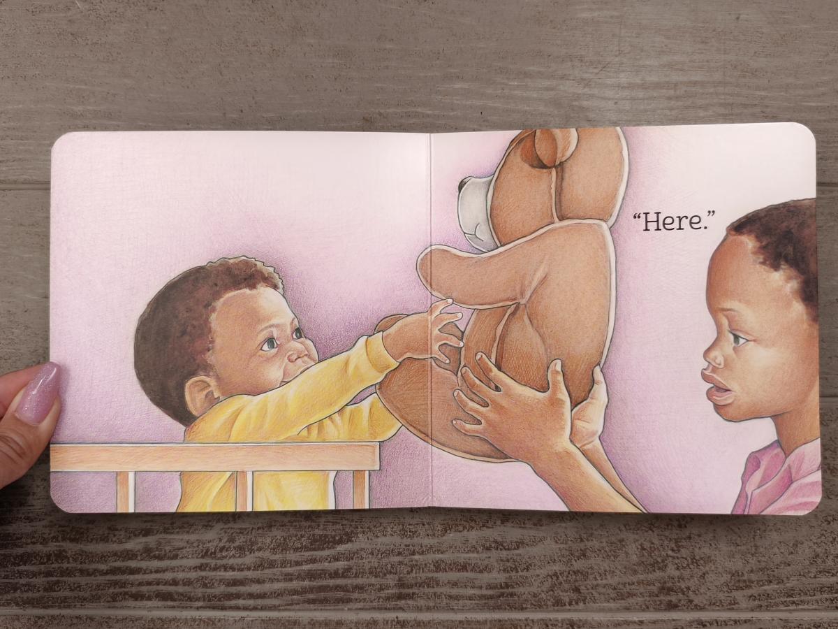Лаконичный текст и яркие иллюстрации рассказывают историю двух братьев, живущих в разных концах комнаты. Старший брат играет с кубиками на полу, а любопытный малыш внимательно наблюдает за ним из своей кроватки.