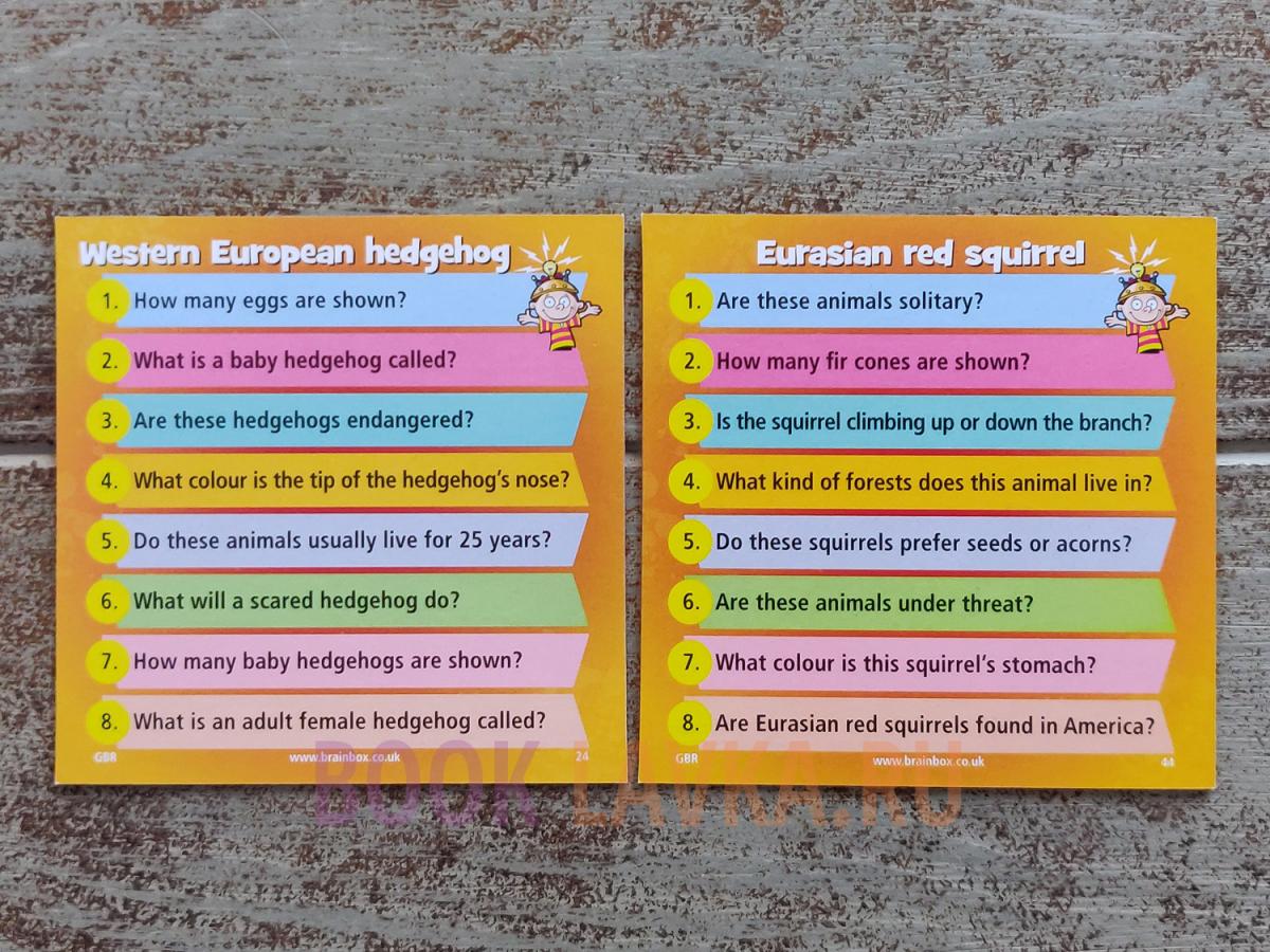 На карточках 54 вида животных. Вверху карточки указано название животных, в нижнем левом углу – основная инфо, также на карточке представлены интересные факты из жизни животных.