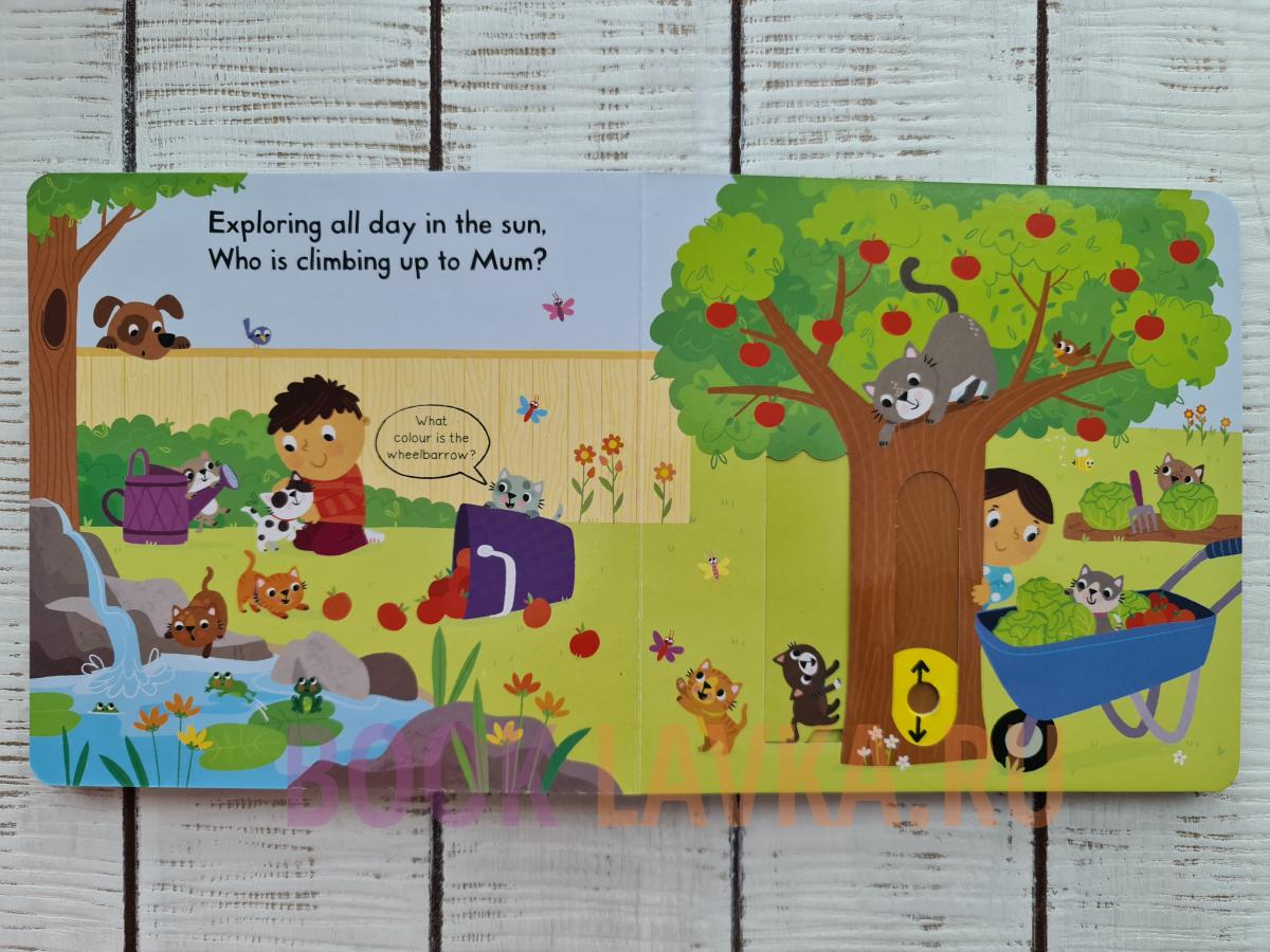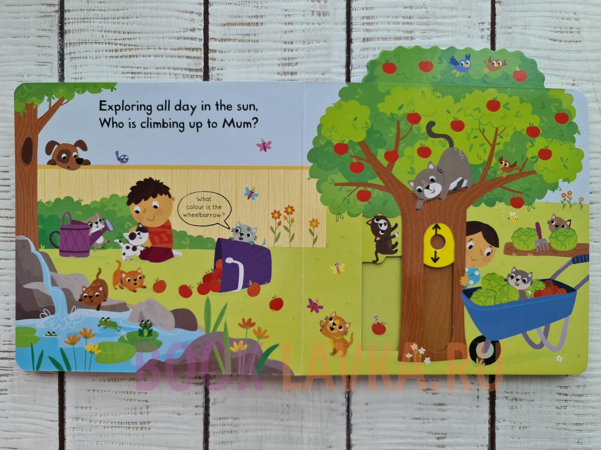 In Busy Kittens, children can have lots of fun pulling, pushing and turning the mechanisms. Join in with the fluffy kittens as they play hide and seek, scamper up trees and lick their food bowls clean.