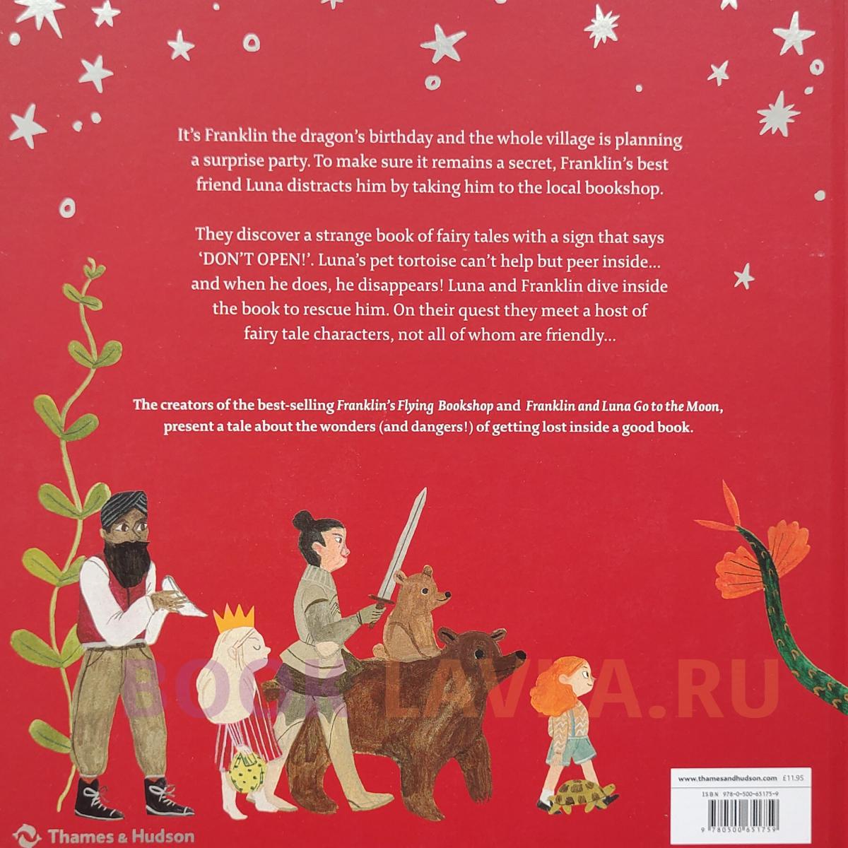 It's Franklin's birthday! Luna and all the villagers are planning a surprise party, and Franklin's family are visiting from the moon. While the party is being set up, Luna takes Franklin book shopping. They find a padlocked book of fairy tales, which the bookseller tells them is full of dangerous magic. Luna's tortoise, Neil, can't help picking the lock... but when he peers inside, the book swallows him whole. Franklin and Luna dive into the book to rescue Neil. They tumble into cobwebbed forests and meet dusty fairy-tale characters who have been trapped inside these pages for hundreds of years.