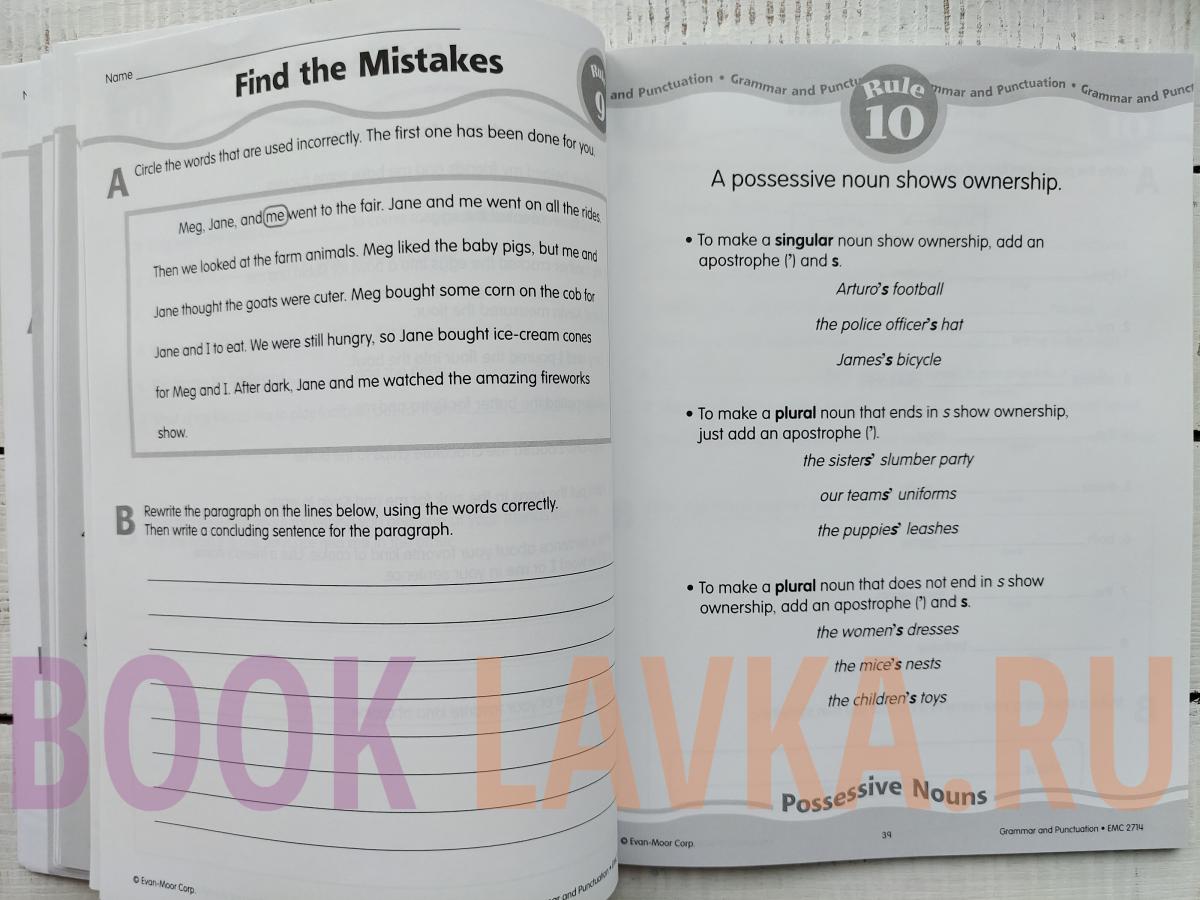 Grammar and Punctuation, Grade 4 provides rule charts and practice pages for these grammar and punctuation skills: - kinds of sentences - simple & complete subjects and predicates - common, proper, singular, plural nouns - irregular plurals - using I and me correctly - possessive nouns & pronouns - kinds of verbs - subject-verb agreement - forming verb tenses - irregular verbs - adjectives - comparative and superlative adjectives - adverbs - comma usage - quotation marks - tricky word usage