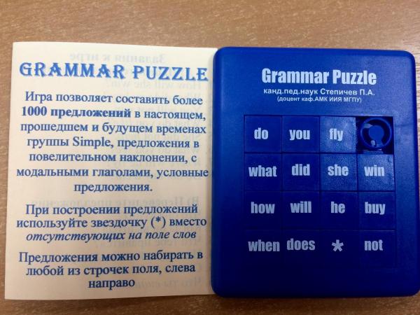В наборе: -игровой планшет Варианты игры: С авторской разработкой Степичева П.А. вы можете составить свыше 1000 вопросительных предложений во временах группы Simple (настоящем, прошедшем, будущем). Примеры заданий: 1) перевод предложений (Как она выиграла? - How did she win?) 2) подобрать вопросы к ответам (например, ответ: in Septemner; собираем вопрос: Whan did you win). 3) предложения на слух (напр., What does buy buy?) 4) составить предложение по грамматическим условиям (напр., составьте вопросительное предложение в Past Simple) 5) распределить слова так, чтобы во всех строчках игрового поля были правильные предложения.