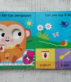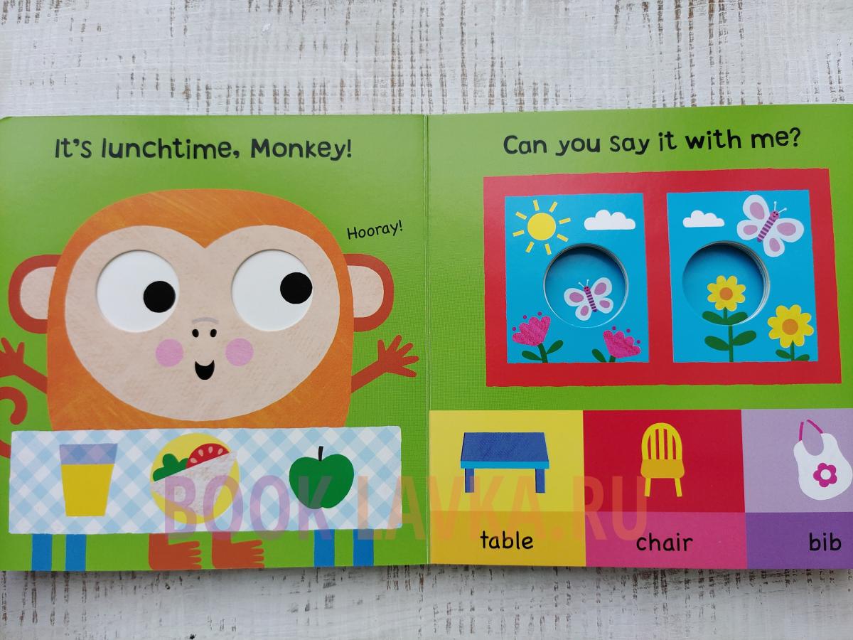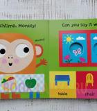 Bold, googly eyes and a sliding mechanism bring this adorable monkey to life, while children share the simple story and point at the bright pictures.