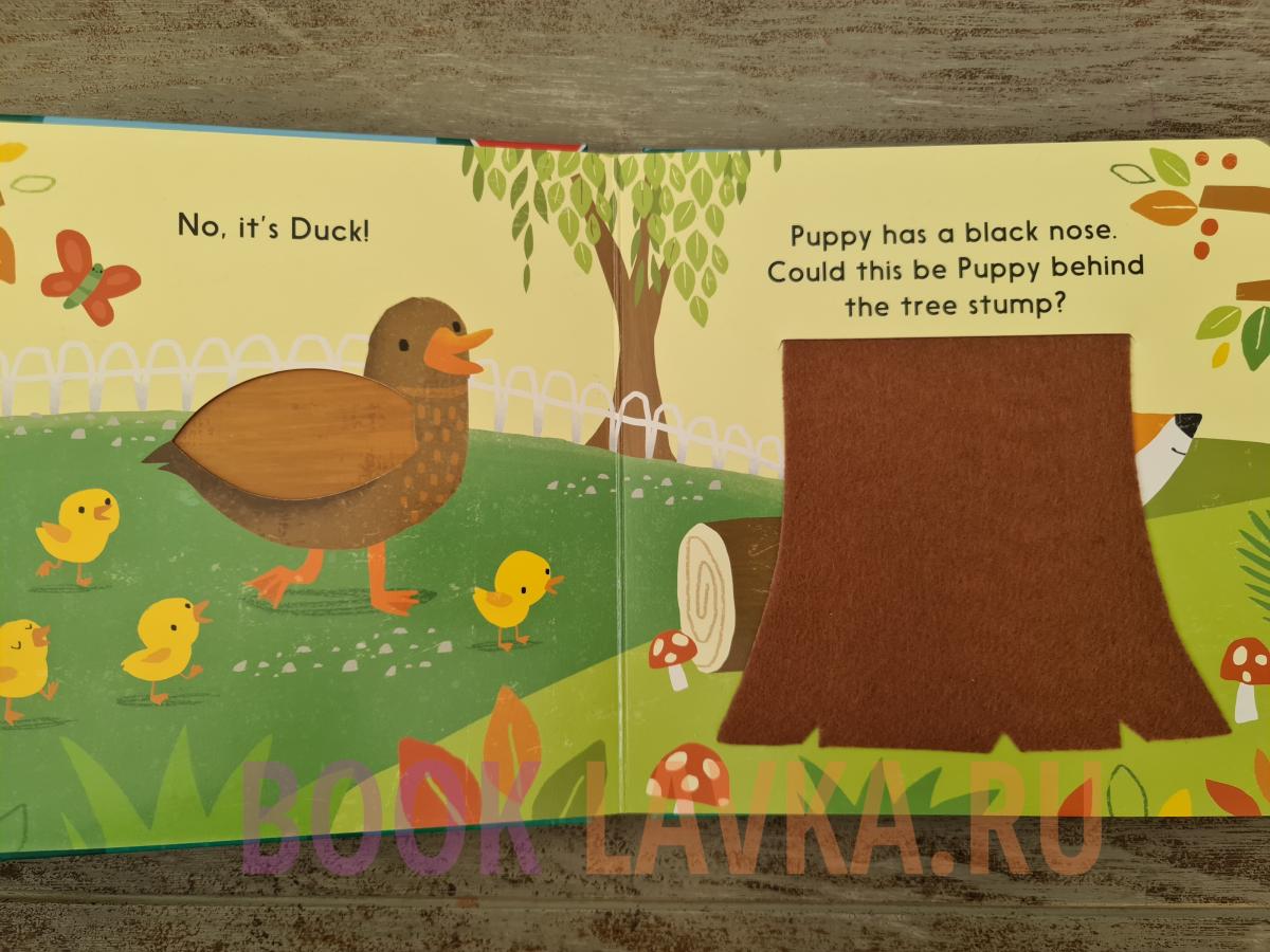 Puppy is hiding. Let's go and find him! There are lots of animals playing in the park, but could any of them be Puppy? Peek through the pages and lift the touchy-feely felt flaps to find out!