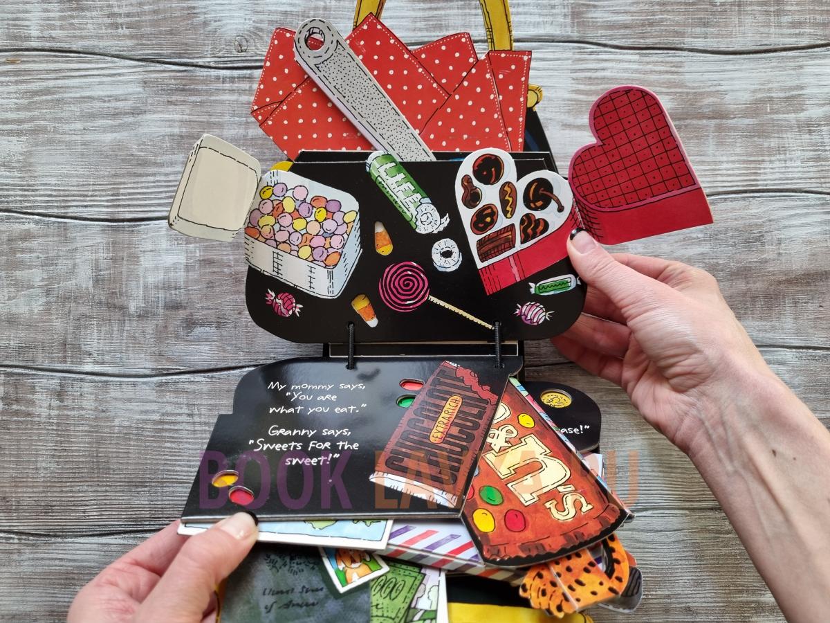 Дети могут носить её с собой куда угодно. Книга открывается на восьми прочных, индивидуально вырезанных листах, на которых множество интерактивных предметов, иногда неожиданных! Восхитительная история, рассказанная с помощью бабушкиных сокровищ. Дети могут просмотреть все штампы в ее паспорте и примерить ее солнцезащитные очки и кольца. Новинками являются банан с шуткой и смартфон, который эта бабуля любит, чтобы идти в ногу со временем. Мини-издание битком набито объектами, которые можно исследовать!