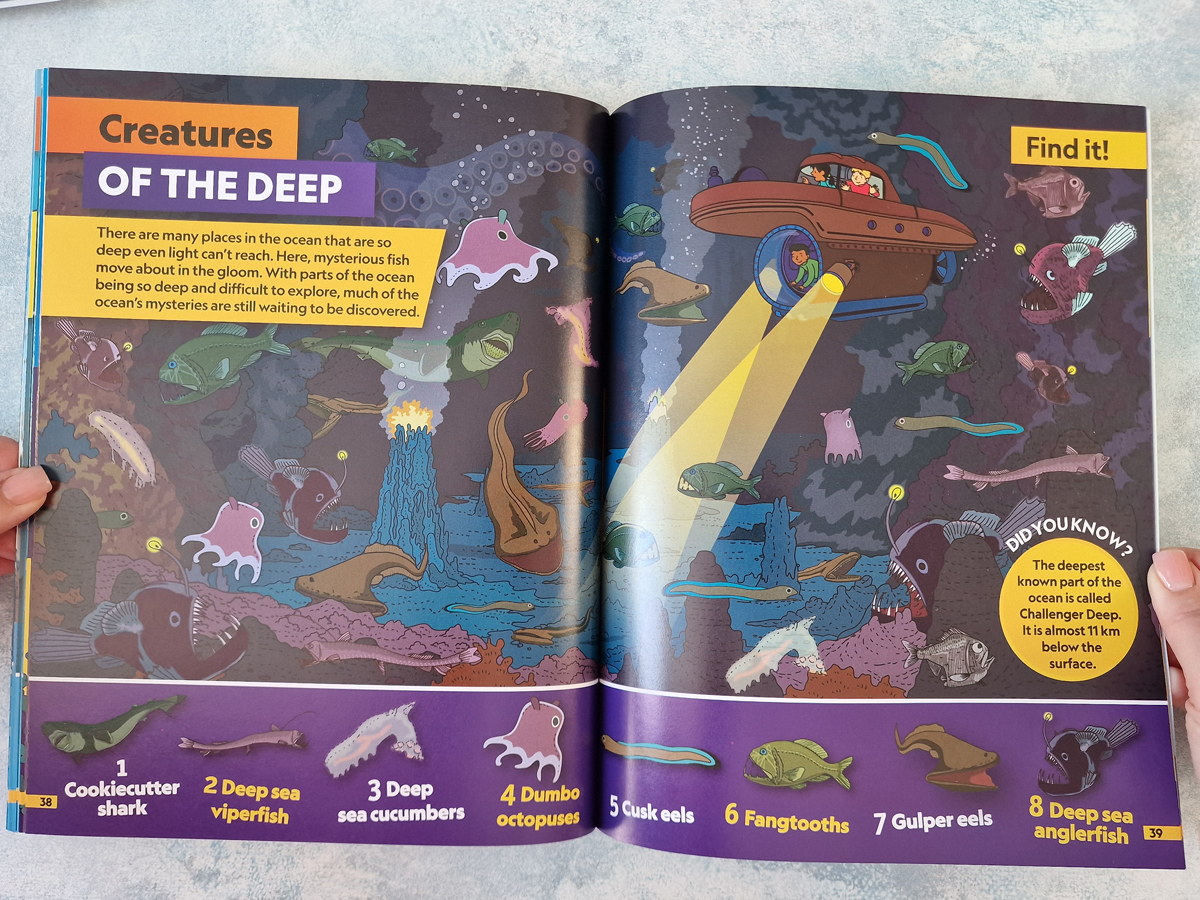 Dive beneath the waves with this fun search and find fact book from National Geographic Kids. Find it! Search the busy illustrated scenes to find more than 250 sea creatures. From the Great Barrier Reef to the Arctic Ocean, shallow rockpools to the deepest, darkest depths they are sure to keep young readers entertained. Explore it! Discover amazing facts all about the creatures spotted. Did you know great white sharks can have up to 300 teeth? That narwhals get called the unicorns of the sea? Or that beluga whales can swim backwards? With colourful photos and lots of fun activities that kids will love it’s the perfect book for kids and grown-ups to enjoy together!