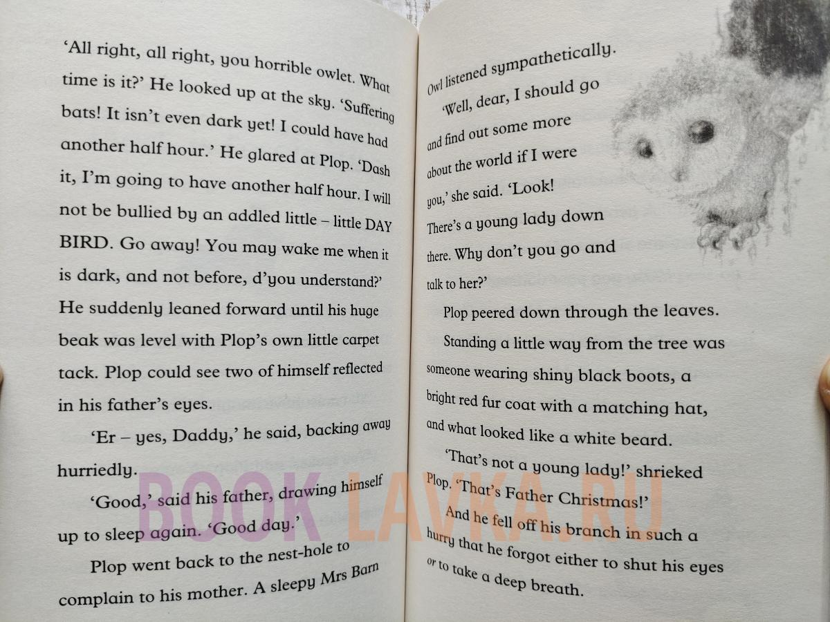 Plop, the Baby Barn Owl, is like every Barn Owl there ever was, except for one thing - he is afraid of the dark. "Dark is nasty" he says and so he won't go hunting with his parents. Mrs Barn Owl sends him down from his nest-hole to ask about the dark and he meets a little boy waiting for the fireworks to begin, an old lady, a scout out camping, a girl who tells him about Father Christmas, a man with a telescope and a black cat who takes him exploring. He realizes that through these encounters that dark is super after all.