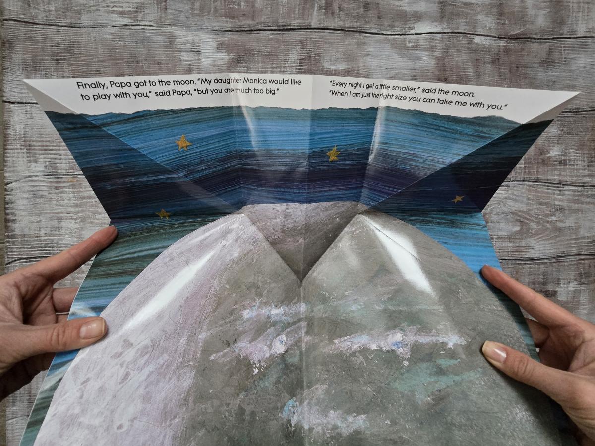 Моника мечтает поиграть с луной, но она слишком высоко, слишком далека... почти недосягаема! Тогда её папа решает попытаться: поднимается всё выше и выше, а страницы книги раздвигаются в стороны и вверх, превращая историю в почти настоящее путешествие к ночному небу.