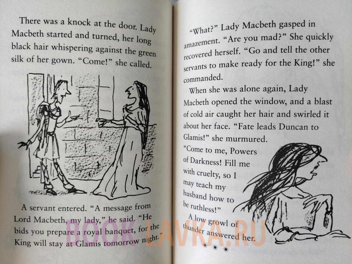 Вон отсюда, проклятое пятно! Блестящий пересказ классической истории о ведьмах, убийствах и безумии. С заметками о Шекспире, театре "Глобус" и "Зле в Макбете".Сказки были пересказаны на доступном языке и с помощью увлекательных черно-белых иллюстраций Тони Росса каждая пьеса живо воплощена в жизнь, позволяя этим культурно обогащающим историям делиться с максимально широкой аудиторией. Вы читали все рассказы Шекспира? Доступные в этой серии: Сон в летнюю ночь, "Макбет", "Ромео и Джульетта", "буря", "Гамлет", "Двенадцатая ночь", "Антоний и Клеопатра", много шума из ничего, Венецианский купец, Генрих V, Юлий Цезарь, как вам это понравится", "Отелло", "Укрощение строптивой", " Ричард III и Король Лир.