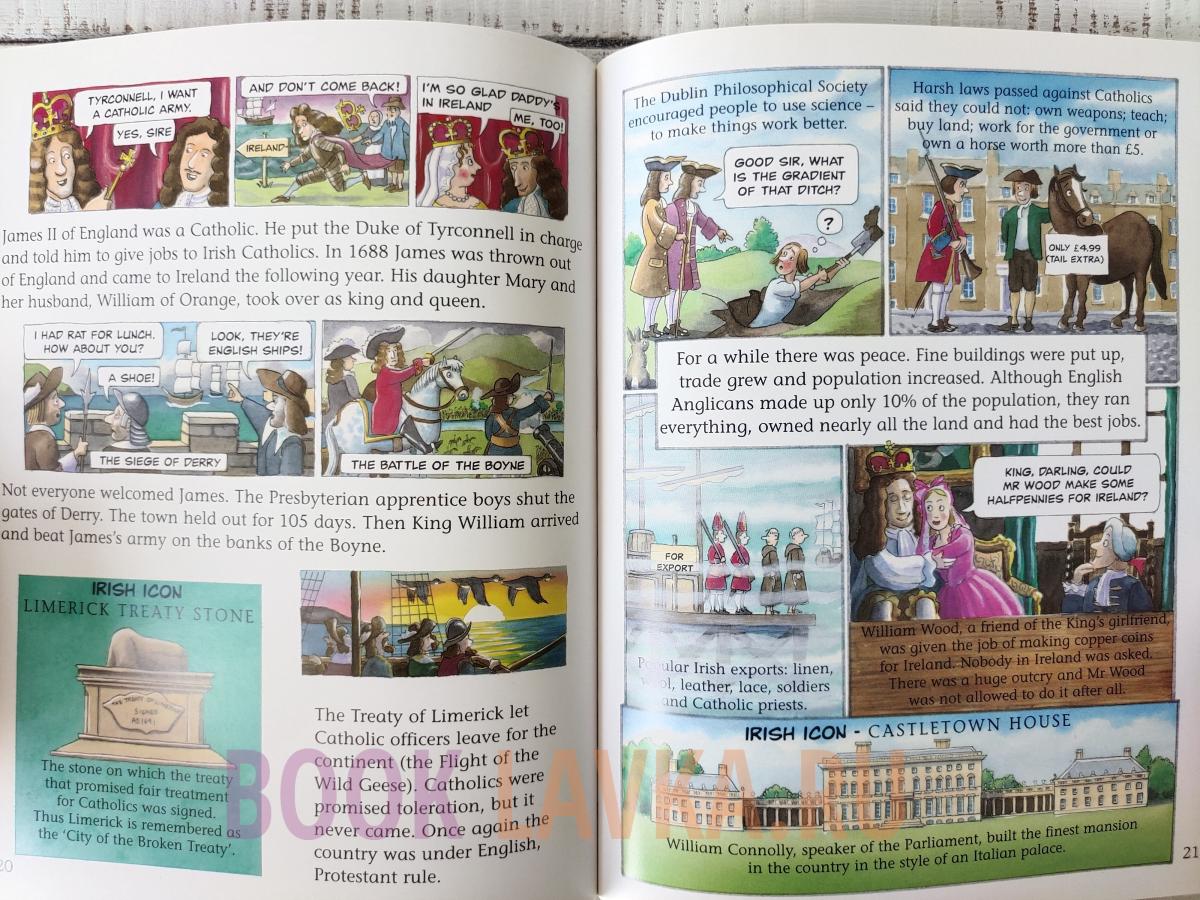 Комическое, красочное и лаконичное, с коротким текстом, множеством картинок и шутливых подписей, это блестящее введение в историю Ирландии. От его живописных карт на торцевой бумаге до панно "ирландских икон", начиная от Брайана Бору и заканчивая театром Аббатства, он полон полезной и увлекательной информации. История, которая часто бывает сложной и бурной, рассказывается с чувством и ясностью, от первых легенд до наших дней.