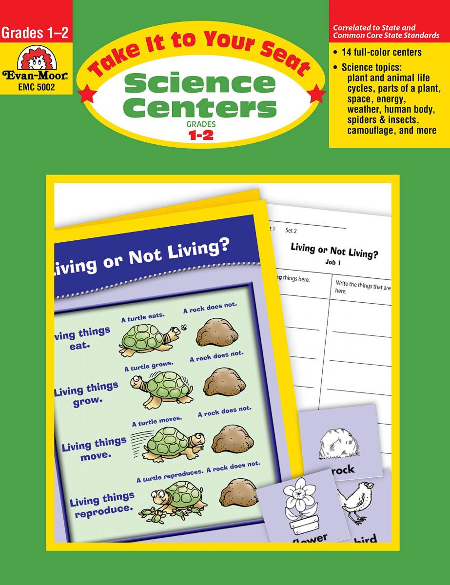 Take It to Your Seat Science Centers, Grades 1-2 has everything you need for 14 centers to explore science concepts and practice literacy skills. These centers, stored in folders or plastic envelopes, are ideal for small groups and individual practice. The concepts covered include: - living or not living? - classifying - spiders and insects - animal life cycles - animal body - camouflage - parts of a plant - plant life cycles - edible plant parts - human body parts - sun, Earth, and moon - energy weather - work
