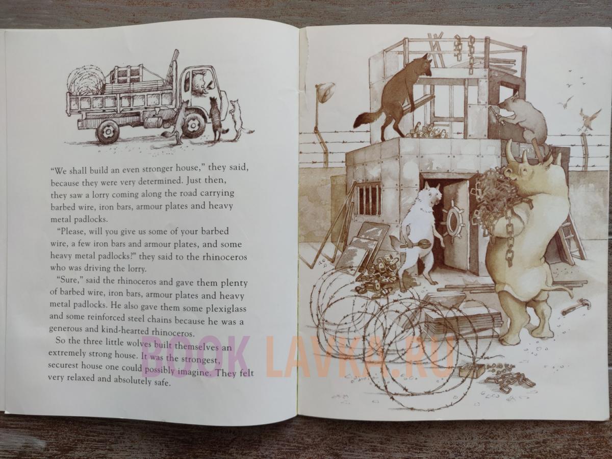 The classic fight between pigs and wolves as you've never seen it. The three little wolves erect first a solid brick house. The big bad pig comes along and when huffing and puffing fails to work, he uses a sledgehammer to bring the house down. Next they build a home of concrete: The pig demolishes it with his pneumatic drill. The three little wolves choose an even stronger design next time round: They erect a house, made of steel, barbed wire, armor plates and video entry system, but the pig finds a way to demolish it too. It is only when the wolves construct a rather fragile house made of cherry blossoms, daffodils, pink roses, and marigolds that the pig has a change of heart...Witty, subversive and a brilliant read aloud picture book. Eugene Trivizas' text for The Three Little Wolves and the Big Bad Pig is perfectly complemented by Helen Oxenbury's watercolour illustrations.