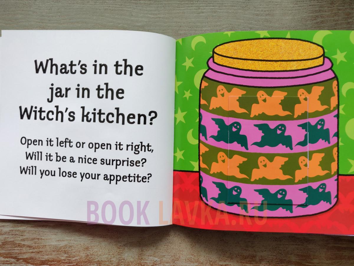 Каждый разворот здесь открывается в разные стороны – и в зависимости от того, куда потянешь клапан, внутри будет либо что-то вкусное… либо что-то жутковатое (но смешное!). Например, открываешь шкафчик влево – тебе попадаются вкусняшки вроде попкорна, тянешь тот же флэп вправо – грустный сгоревший призрак.